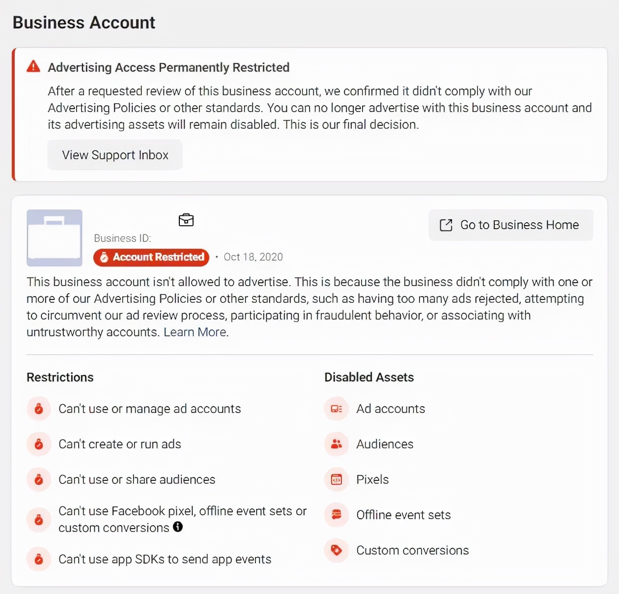 5.禁止使用BM账户业务平台。这种情况表明您的业务平台无法使用。此时,您需要检查您的ads帐户是否正常。如果正常,您只需重新创建一个新的BM帐户